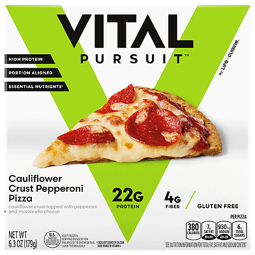 Introducing Vital Pursuit™ Cauliflower Crust Pepperoni Pizza – a delectable fusion of a cauliflower crust topped with pepperoni and mozzarella cheese, crafted to offer you a satisfying and wholesome lunch or dinner. Our pizza is designed for those who seek convenience without compromising on nutrition. This frozen pizza has twenty-two grams of protein and four grams of fiber per serving, ensuring that you stay fueled and satisfied throughout your day the right way. Our portion-aligned individual pizza is thoughtfully created with essential nutrients, delivering an excellent source of calcium and a good source of vitamin A. With no artificial colors, you can support your weight management journey with our cheesy cauliflower crust pizza and crush your goals.