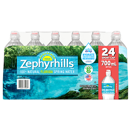 Get back to nature with Zephyrhills Brand Florida Spring Water. Carefully sourced from natural springs located in the great state of Florida, it contains naturally occurring electrolytes for a crisp, clean taste you'll love. And with a better bottle made with 100% recycled plastic* and 100% recyclable, you know that you're not just getting the best that nature has to offer, you're doing your best to help us conserve it too. So grab a pack and get ready for whatever fuels you. Zephyrhills water is available in a variety of sizes, so you can easily stay hydrated no matter where you are. From your gym bag to your hiking pack, at the office, on the go or at home, you can pick up the perfect size for wherever your life takes you. Stock the fridge so your family always has crisp, refreshing hydration on hand. Plus, the more you drink, the more you can earn with The Rewards Drop. Get points with every purchase toward event tickets, merchandise and more – see packaging for details. It's one more reason to enjoy the distinctively fresh taste from the Sunshine State. *20 oz, 700mL, 1L, 1.5L still water bottles only. Excludes label and cap.